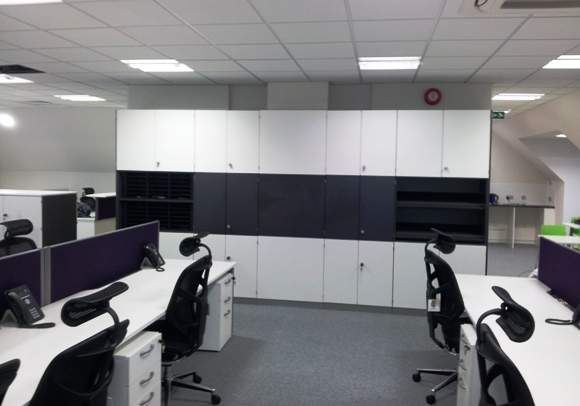 This end view of the Allvia Storagewall, from Assmann, showing the two-tone white and slate finish.