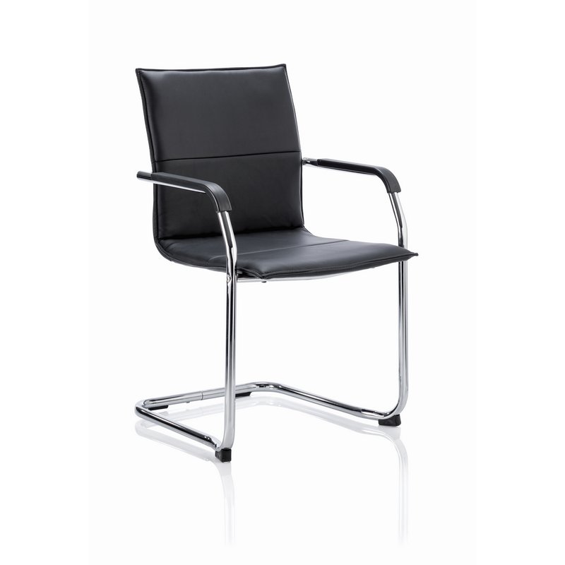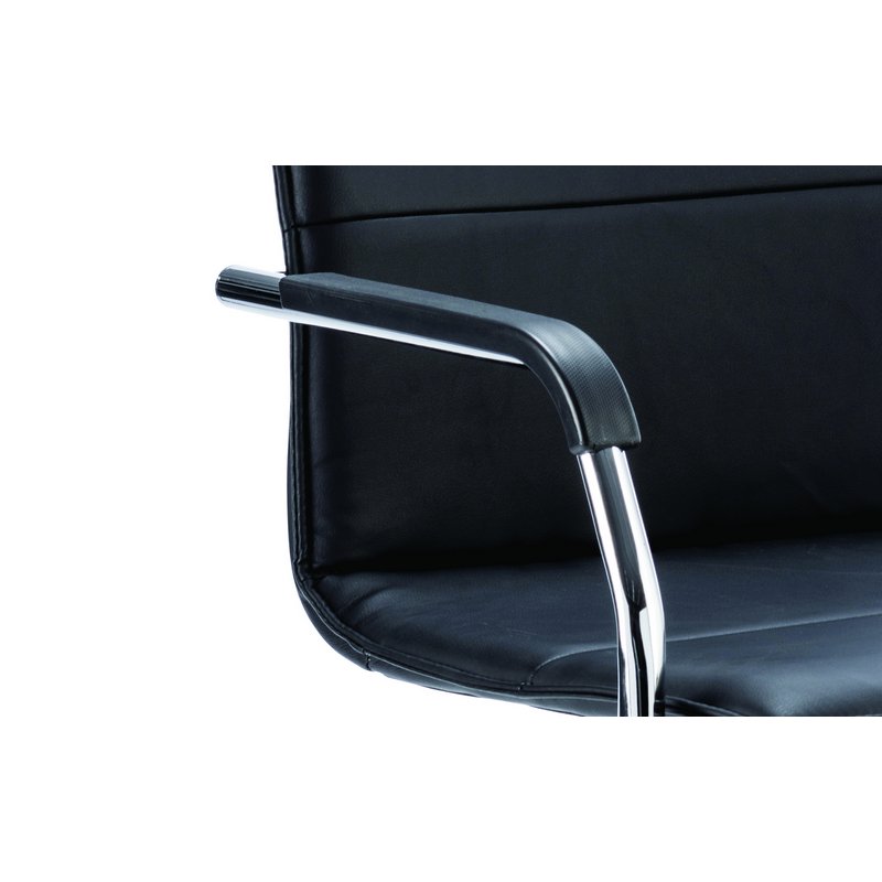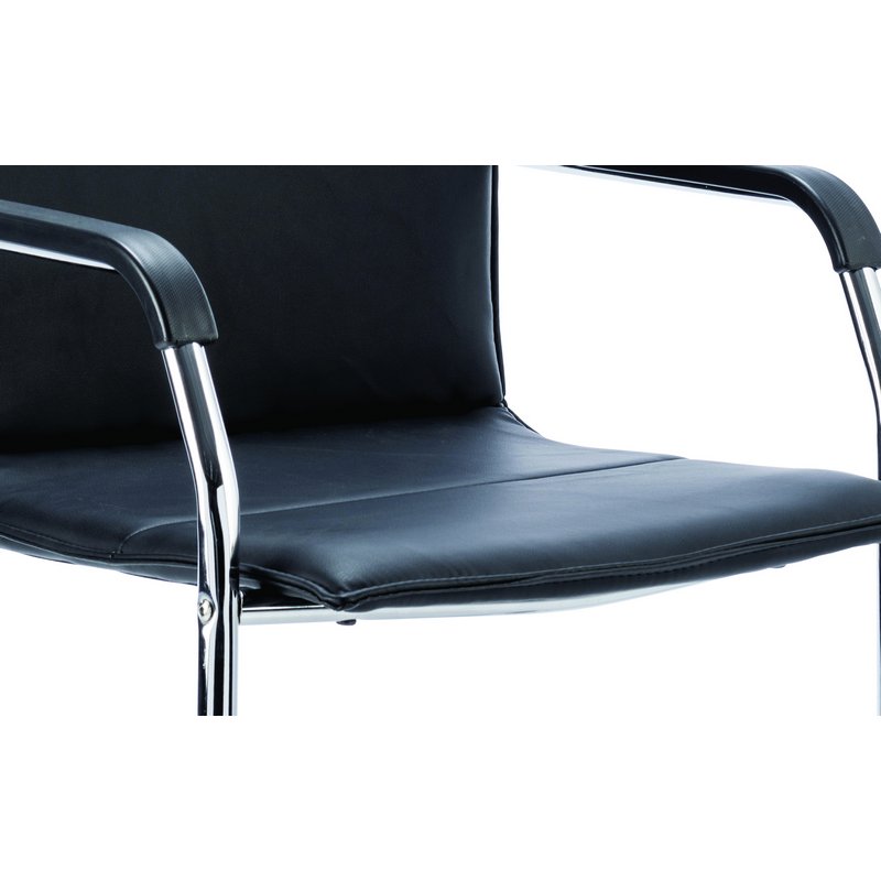 Echo chairs offer a panelled design seat and back, upholstered in soft bonded black leather. It sits on a chrome cantilever frame and features fixed arms with PU armpads. The Echo meeting chair is stackable up to 4 high.